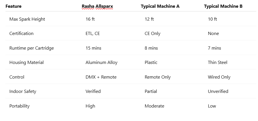 Compared to budget machines, which may lack any form of thermal regulation or emergency control, Allsparx ensures peace of mind in venues with fire code restrictions or high-value equipment.