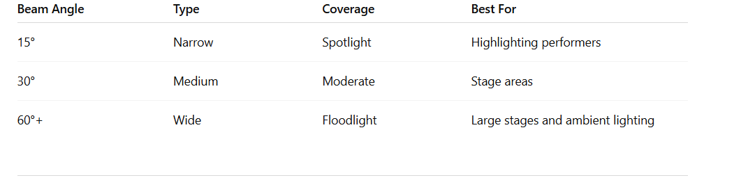 - Small Stages (10–20 ft wide): Narrow or medium beams are sufficient to highlight performers and provide adequate coverage without overpowering the space.