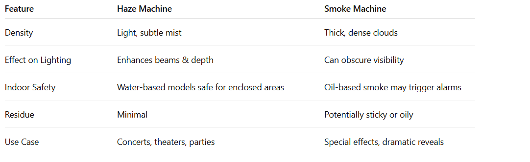 Although haze and smoke machines are often used interchangeably, they serve different purposes: