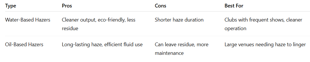 For most clubs, the quiet, water-based DMX hazer is the sweet spot. It combines clean operation with professional control, ensuring seamless integration into existing lighting setups.