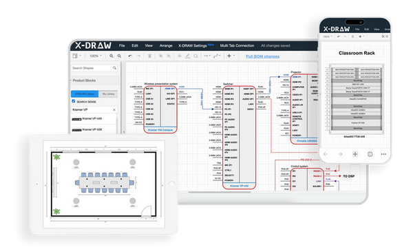 The platform includes X-DRAW, a powerful AV system design and diagramming tool that automates the creation of line schematics, signal flow diagrams, rack layouts, and floor plans. X-DRAW simplifies complex designs into easy-to-understand diagrams, providing a clear visual representation of the AV system. This automation not only saves time but also reduces errors, ensuring accurate and efficient designs.