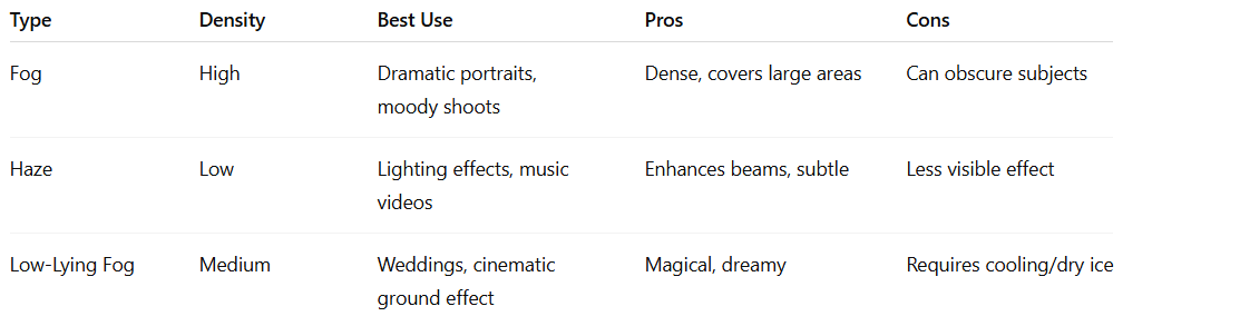 Selecting the right machine depends on your shoot type, environment, and creative goals. Here’s a practical guide: