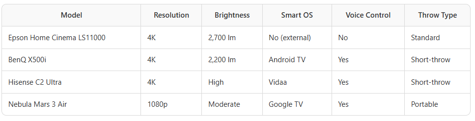 A: Look for models from Epson, BenQ, LG, or Hisense with built-in smart features and compatibility with your preferred ecosystem .