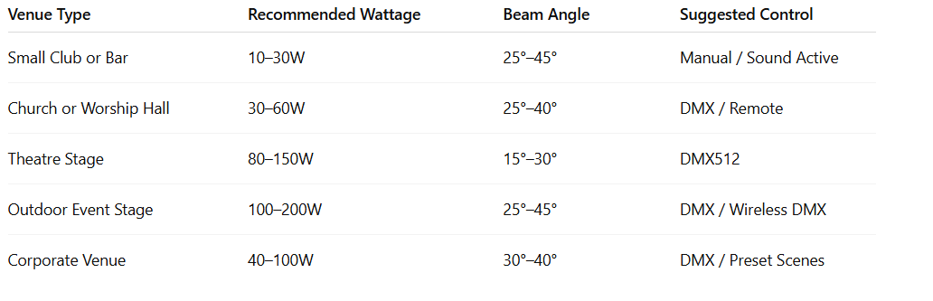 The first step in choosing your LED Par Can is identifying your venue’s type and purpose. Each environment demands different beam strengths, mounting methods, and control options.