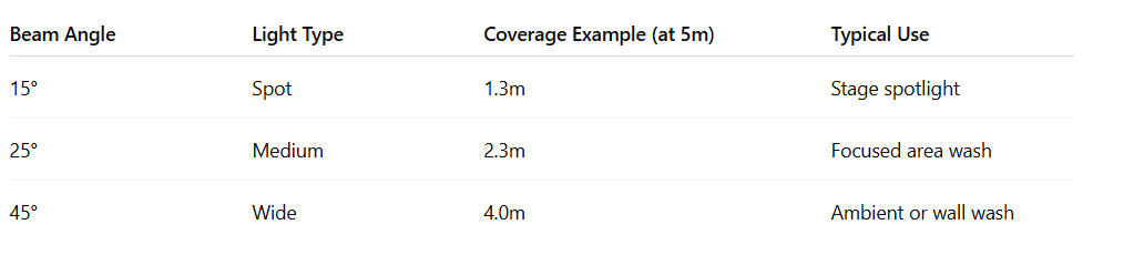Beam angle defines the spread of the light. A narrow beam (10°–20°) focuses light like a spotlight, ideal for accent lighting or highlighting performers. A wide beam (30°–60°) washes broader surfaces such as walls or stages.