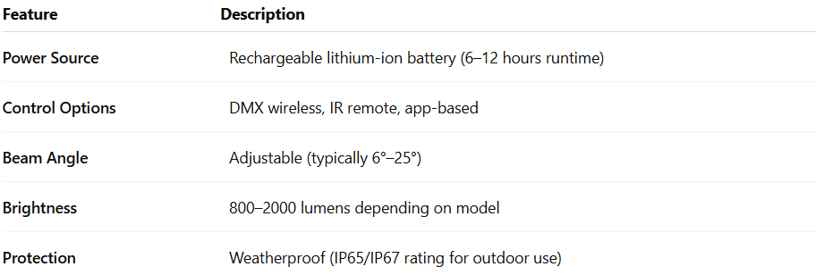 Battery powered bullet pin wash lights are compact, LED-based fixtures designed to produce powerful, focused beams or wide washes of color. Unlike traditional wired lighting, these lights operate on rechargeable lithium batteries and often feature wireless DMX or app-based controls.