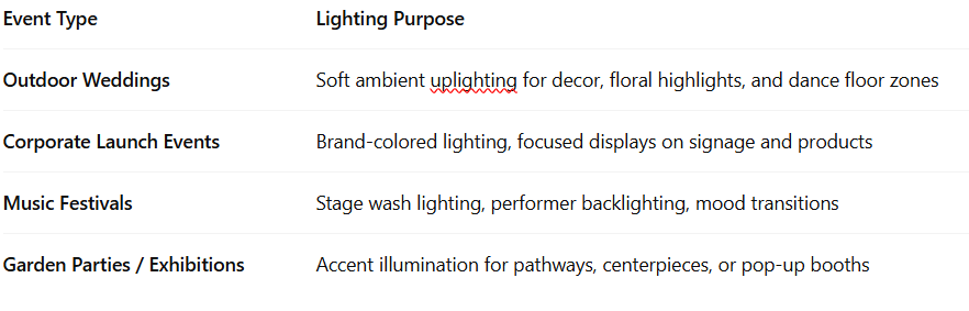 These lights are also used in film shoots, exhibitions, and theatrical outdoor setups where quick mobility and reliable brightness are critical.