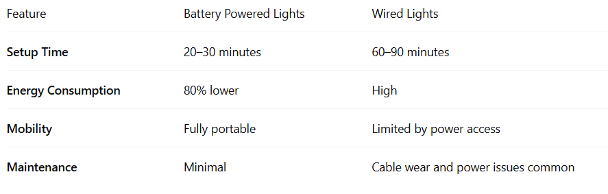 Modern lithium-ion batteries power these lights for 6–12 continuous hours, enough for most evening events. Quick-charge systems allow full recharge in 3–4 hours, ensuring back-to-back event readiness.