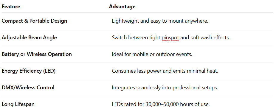 - Advanced models include zoom or focus-adjustable lenses, letting users shift from pinpoint accuracy to wash effect dynamically.