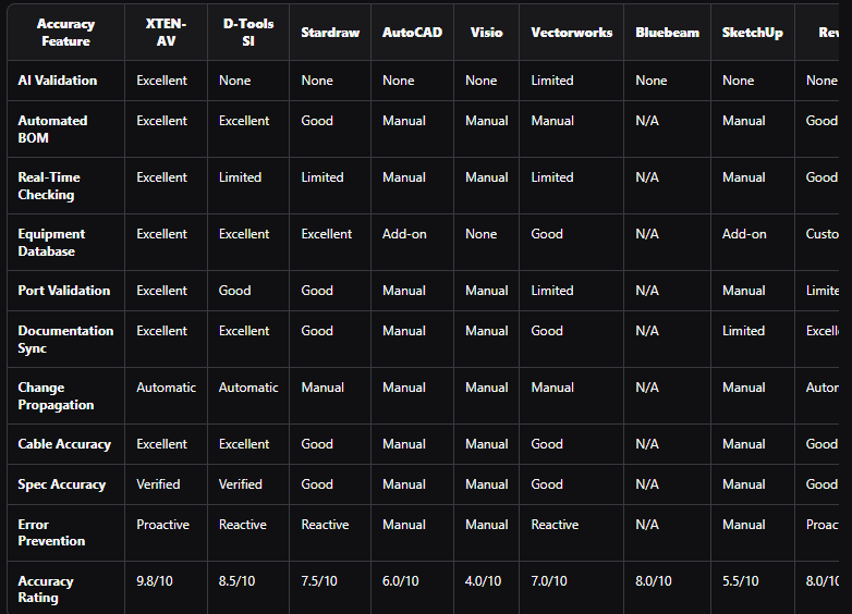 Critical accuracy features include: automated BOM generation (prevents 90% of material errors), real-time compatibility validation (catches connection issues immediately), verified equipment databases (ensures specification accuracy), automated documentation sync (maintains consistency), change propagation (updates all related documents), AI-powered validation (catches errors humans miss), and version control (prevents working from outdated information). XTEN-AV includes all these features in a comprehensive platform.