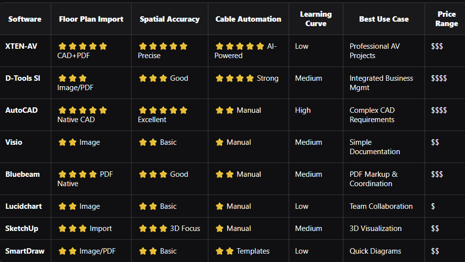 This comprehensive guide examines the 8 best cable management software platforms offering advanced floor plan integration, with particular focus on XTEN-AV—the industry-leading solution that sets the benchmark for spatial cable design and architectural visualization.