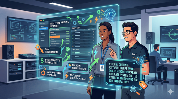 However, choosing the best AI quoting software for AV design and engineering isn't straightforward. The right platform must understand the unique complexities of audiovisual systems—from equipment compatibility and signal flow requirements to installation labor estimation and project-specific pricing variations. Generic sales quoting tools designed for product sales simply cannot address the technical nuances of custom AV integration, where every project involves unique equipment configurations, site-specific labor factors, and complex cost structures spanning equipment, installation, programming, commissioning, and ongoing support.