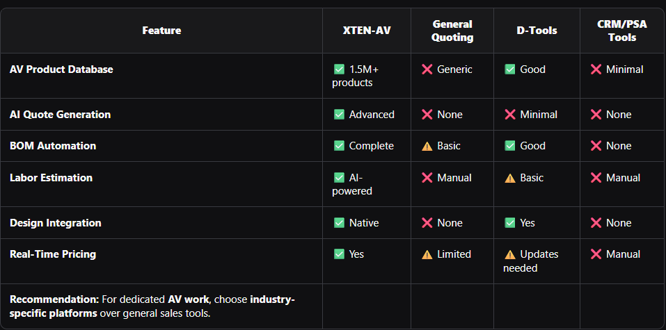Traditional manual methods cannot deliver consistently. AI quoting software has transitioned from competitive advantage to competitive necessity for successful AV businesses.